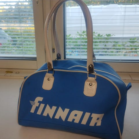 Vanha Finnairin laukku. Koko n. 23x19cm. Vetoketju. Reunus alaosasta lohjennut(kuvassa)