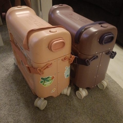 • toimii käsimatkatavaralaukkuna, jonka päällä lapsi voi istua vanhemman vetäessä laukkua