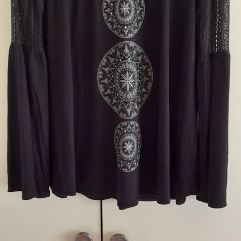 Musta Desigualin trikoopaita. Kainalo-kainalo n. 41 cm, olka-helma n. 73 cm. Helma on takaa pidempi kuin edestä.