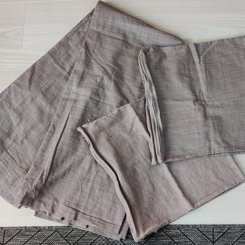 Jotexilta ostetut sivuverhot, kaksi kappaletta. Olleet käytössä, mutta siistissä kunnossa edelleen, ei suurempia käytön jälkiä. Väri harmaa, ehkä hieman siniharmaaseen taittava sävy. Läpikuultavat.