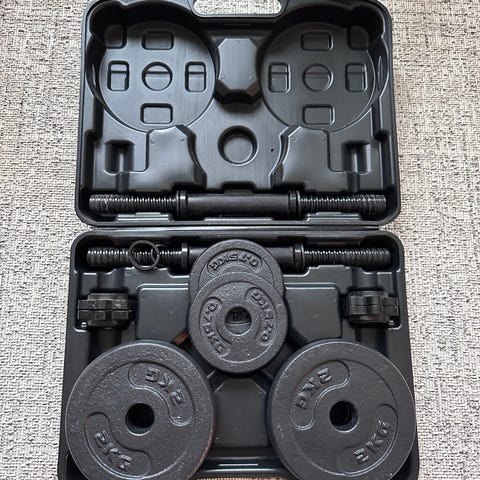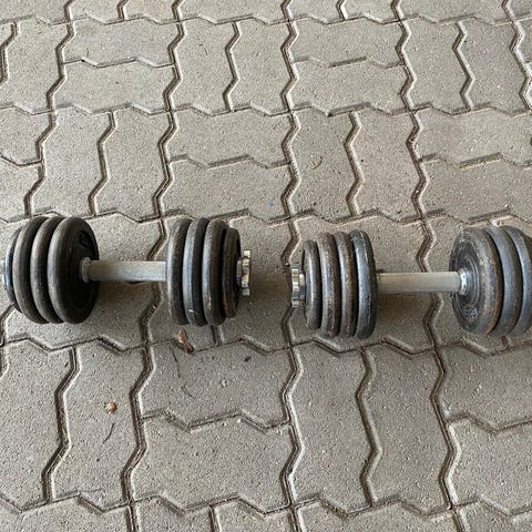 Kaksi käsipainoa: Asenna painot tangon molemmille puolille ja kiristä puristimet huolellisesti. Kaksi käsipainoa sopivat täydellisesti hauis-, ojentaja-, olkapää-, rintakehä- tai selkäharjoituksiin. Käsipainoilla harjoitteleminen on monipuolista, sillä niiden avulla voit tehdä harjoituksia jokaiselle kehonosalle. Voit harjoitella sekä voimaa että kestävyyttä.