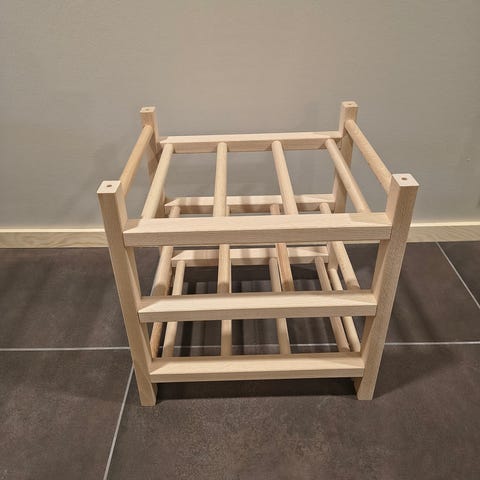 Hyväkuntoinen ja hieno vankkurimallinen pulloteline. Puuta ja metallia. Sopii isommallekkin pullolle kuin kuvassa (0,75l). Pullo ei kuulu hintaan.