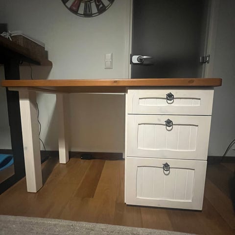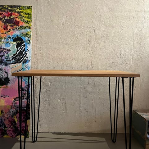 Täysin uusi käyttämätön puusepän valmistama työpöytä/ruokapöytä. Jalkoina Suomessa valmistetut pinnijalat. Jalat on helposti ruuveilla uudelleen kiinnitettävissä ja iroitettavissa.