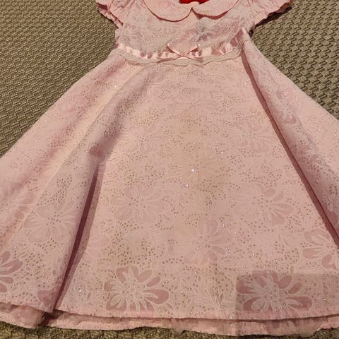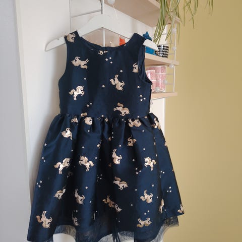 Ihana juhlamekko. Helmassa kolme kerrosta, yhdessä kohtaa pientä langanpurkaumaa mutta ei näy harson alta. Edessä muutama sininen piste, toinen kukan takana, en ole kokeillut poistaa. Takana vyö josta saa kauniin rusetin, vyö ei ole irrotettava. Takana napit. Hajusteeton pesu ja kissatalous.