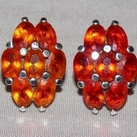 Hopeiset tappikorvakorut pienellä aniliininpunaisella kivellä. Koko n. 1 cm x 1.5 cm. Leima 925. Taustat ovat erilaiset mutta nekin 925 hopeaa.