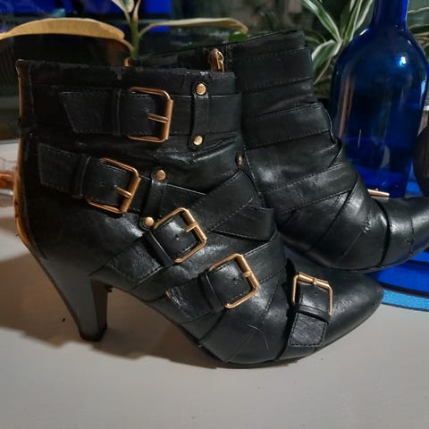 Jenkeistä ostetut hieman cowboy henkiset mustat nilkkurit. Hieman pohjassa kulumaa mutta vielä hyvin käyttöikää ennen kuin korkolappu tarvitsee uusimista.
