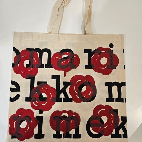 Uusi Marimekon logokassi, luonnonvalkoinen kierrätyspuuvilla + vaaleanpunainen teksti.