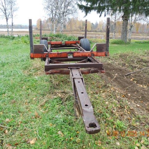 Kahdella telillä vetävä metsäkärry järeällä puomilla ja pyörivällä kouralla. Puomin pituus tyvestä kouraan mitattuna on 4.8 m Mukaan vielä varaosana nosturin tyvipuomin iso hydraulisylinteri. Renkaita uusittu.