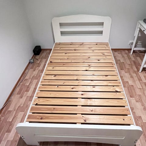 Valkoinen sänkyrunko ja erillinen pääty, pohja puusäleikkö.