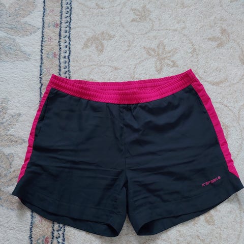 Kuminauha vyötäröllä, monta taskua vetoketjulla ja tarralla, nopeasti kuivuvat, pientä kokoa
