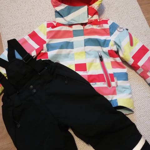 Uudenveroiset takki 110 cm ja housut 104. Housuissa tuntui olevan hieman isompi mitoitus kuin takissa joten näitä käytettiin yhdessä koossa 104-110. Yst ks muutkin ilmoitukseni.