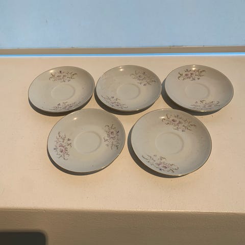 vanhat 4 kpl ehjät lasit ja 2 kpl niihin sopivaa lautasta, kultaukset espressolasissa vähän haalistuneet. korkeus noin 7,5 cm ja leveys noin 5 cm lautaset 10cm levyiset ja 2 cm. korkeat Punssilasi 11x5,5 cm ehjä,