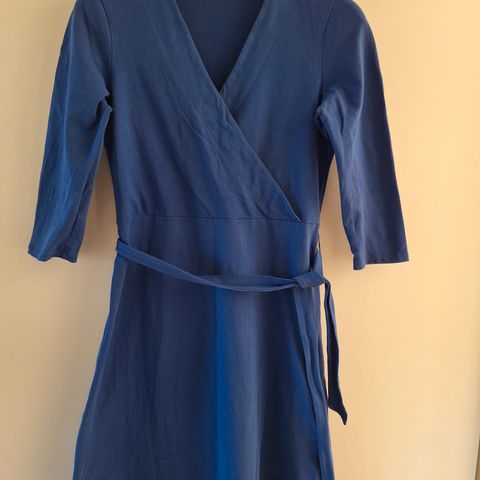 Noomin sini-valko raidallinen pehmoinen trikoo mekko. Sininen palmikoitu vyö. 3/4 osa hihat.