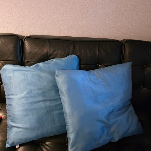 Kaksi sohvatyynyä. Mitat: 45 cm×43 cm. Paksuus noin 20 cm.