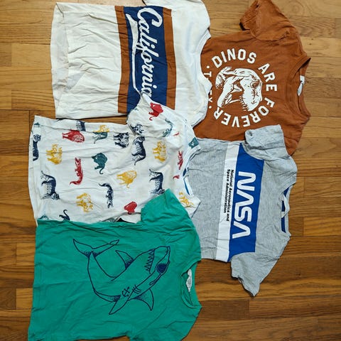 Myydään 5 kpl setti T-paitoja, joista 2 valkoista pikeepaitaa, koko n. 110.
