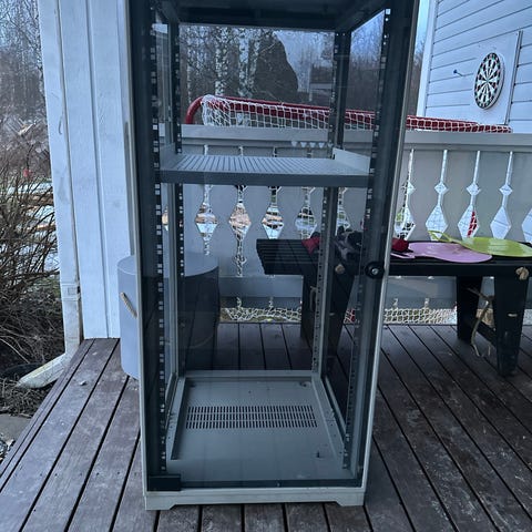 Scanfil metallinen laitekaappi ja sisältö ristikytkentöjä varten. Kaapin koko: korkeus 80,5 cm, leveys 59,8 cm, syvyys 54,5 cm. Kaappi on seinään kiinnitettävä, lukittava ja sisältää kaksi avainta. Otettu käyttöön 2011. Sisällä kytkentäpaneelit HP 1810-24G Switch J9803A. 24 porttia.