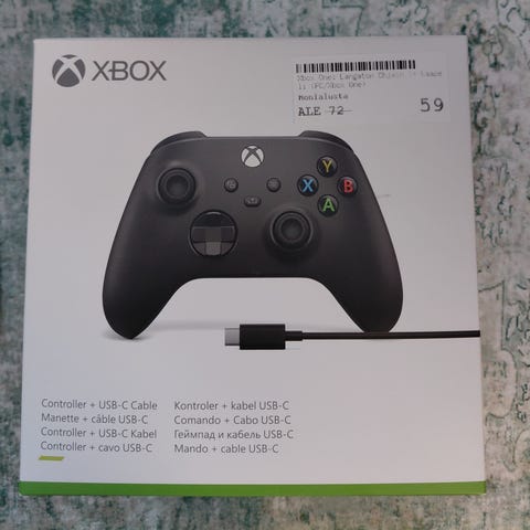 Turtle Beachin Stealth 500X headset Xbox One:lle. Kuten kuvasta huomaa, niin sankojen rangat on kummaltakin puolen rikki. Korjaus kovamuovisen kortin paloilla ja sähköteipillä, jonka ansiosta pysyy kohtalaisen hyvin päässä. Pehmusteissa on myös kulumaa. Muuten soivat pelit. Kuvasta jäi uupumaan laturijohto (usb-A), joka on tallessa ja tulee mukaan.