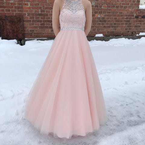 Kokoa 36. Ostettu uutena, yhdet tanssit tanssittu. Mekko on moitteettomassa kunnossa. N. 170cm tanssijalla ollut, tanssittu 6cm korkokengissä.