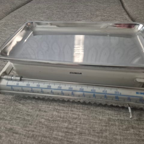 Myydään pieni ja näppärä keittiövaaka. Mukaan 6 desilitraa vetävä muovinen mittausastia. Vaa'an saa säilytykseen mittausastian sisään.
