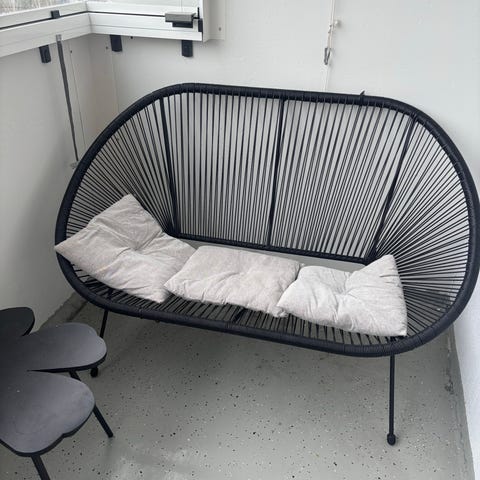 Vuosi sitten ostettu sohva. Päälliset olleet talven sisällä säilytyksessä, ja otettu nyt säiden viilennettyä sisälle. Sohva muuten lasitetulla parvekkeella.