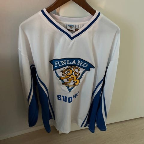 Retro Suomen fanipelipaitoja. Sinisessä koko on 4xl/5xl ja selässä Aho #20. Valkoisessa koko on L/XL ja selässä Rolls #7.