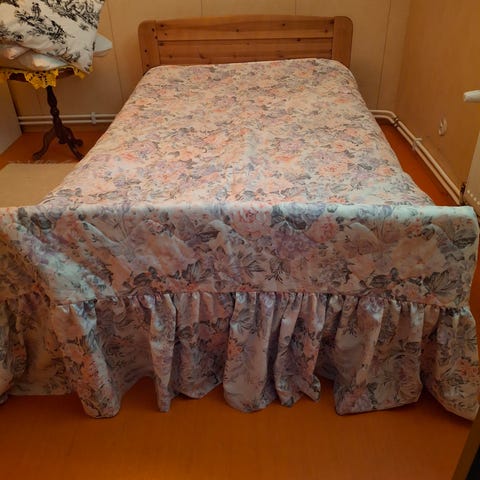 Parisängyn napakka päiväpeitto. Materiaali puuvillaa/polyesteriä. Kaareva reunus päässä. Siisti, ehjä. Pesu 40 asteessa, ei linkoa. Päällinen ruskea/beesi-kuvioinen, alapuoli vaaleaa puuvillakangasta. Yltää hyvin 200x200 kokoiseenkin parisänkyyn. Nouto.