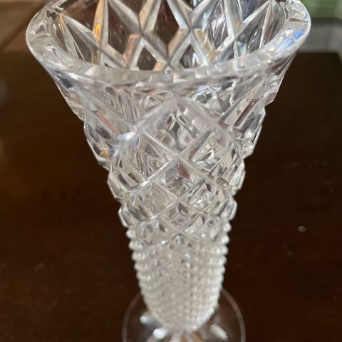 Upea vanha kristallinen maljakko, jossa kauniit leikkaukset ja koristeellinen kukkakuvio. Aitoa kristallia – painava, tukeva ja säihkyvä.