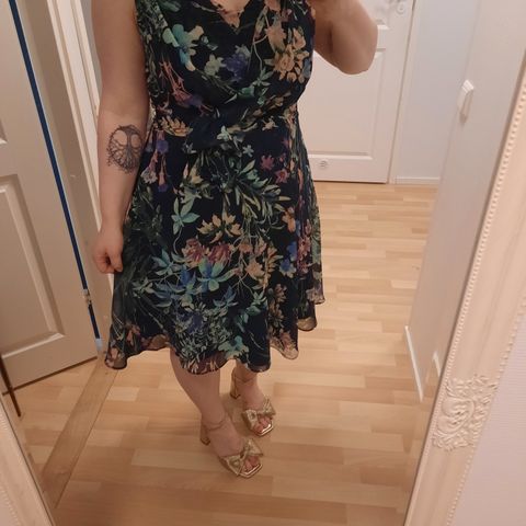 Kaunis, hihaton, kuviollinen Esprit mekko koko 40. Mustalla pohjalla kukkakuvioita. Pituus kainalosta helmaan 75 cm. K-k 100 cm. Selässä 30 cm vetoketju. Vyötäröllä poikkileikkaus. 100 % polyesteri. Pm. 8,90e.