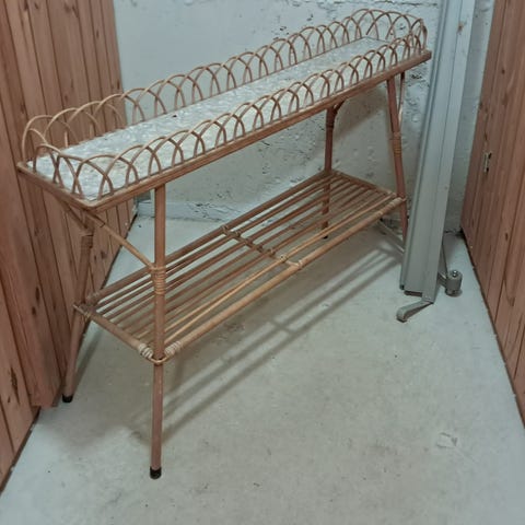 Haku: rottinki, rottinkipenkki, penkki, jakkara, retro, vintage, 60-luku, 70-luku, kukkapöytä, kukkapilari