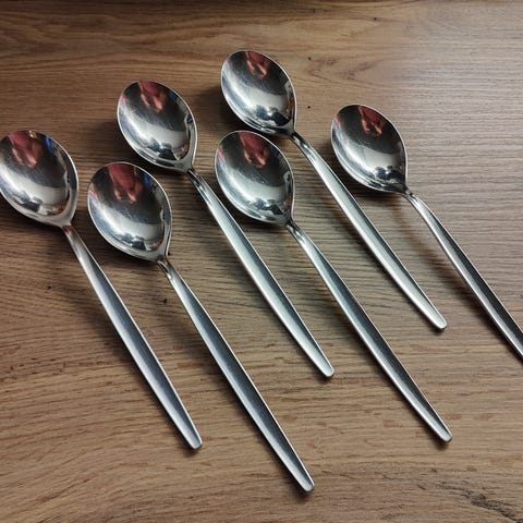 6 kpl Hackman ruokalusikoita. Takana teksti 18/10. Lusikat ovat käyttämättömiä.