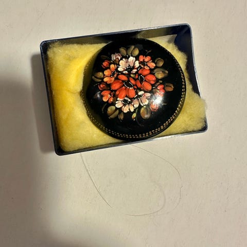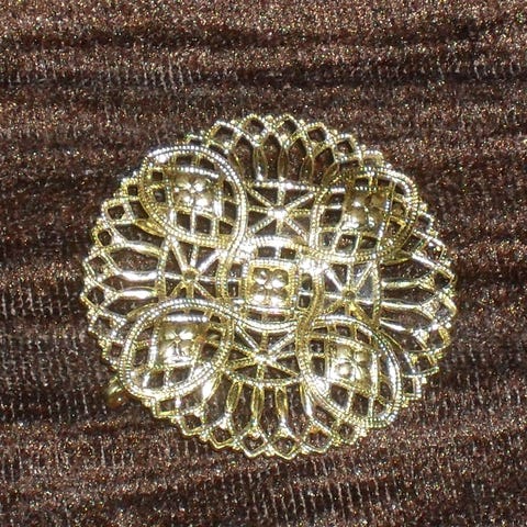 Painava, kookas n. 13 cm korkea rintakoru, pukukoru. Soveltuu esim. vahvakankaiseen jakkuun. Käyttämätön, kullanvärinen, oransseilla ja ruskeilla strasseilla, ehjä, toimiva lukko.