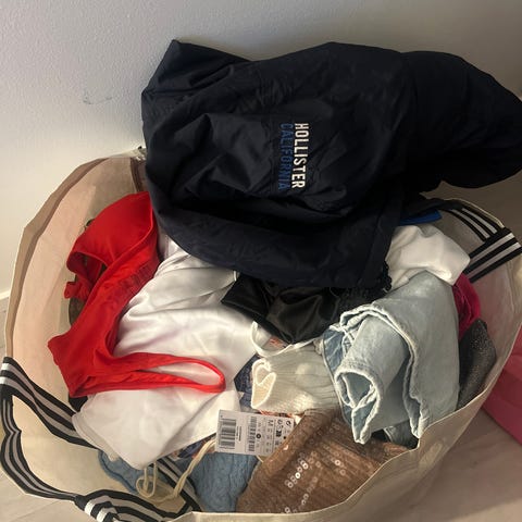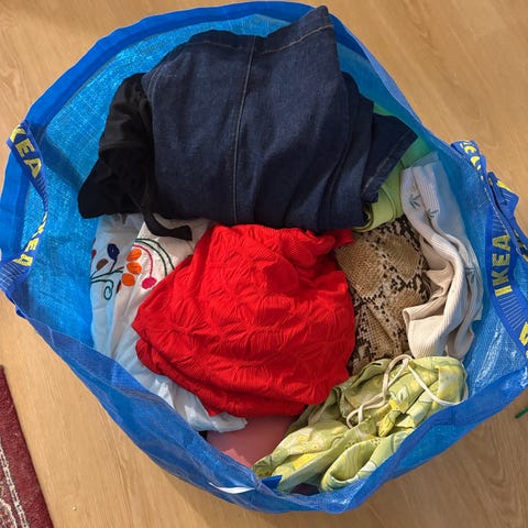 Ikea-kassillinen naisten M-L kokoisia vaatteita.