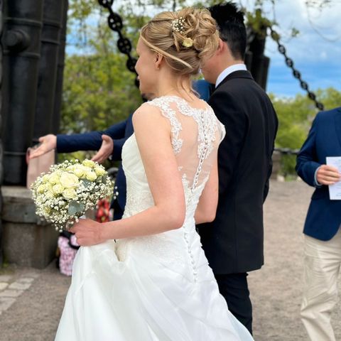 Koko 36, säätövaraa nyörityksen vuoksi selässä. Olkaimet off shoulder, mutta nousee myös olkapäille. Mukaan pukupussi.