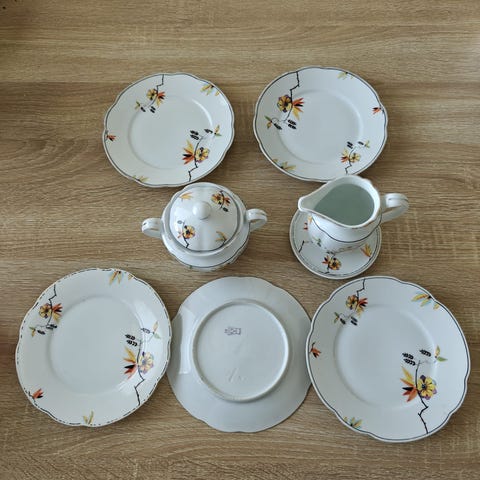 Yhdessä lautasessa selkeä halkeama mutta muuten hyvässä kunnossa