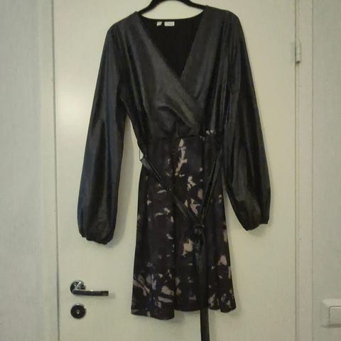 Hauska kultaisilla palloilla oleva musta juhlamekko. Ohuempi läpikuultava päällimekko ja alla alusmekko spagettiolkaimilla. Vähän käytetty, joten oikein siis.