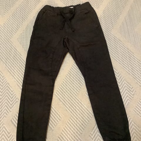 Hyväkuntoiset tummansiniset, farkkumaiset joustavat housut. Vyötäröllä säätömahdollisuus.