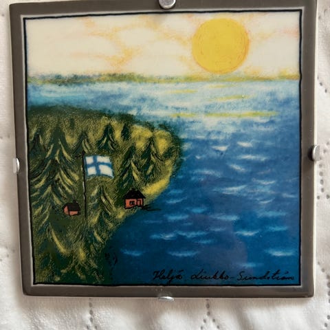 Heljä Liukko-Sundström keramiikkataulu, jossa värikäs saarimaisema: järvi, saari, punaiset mökit ja Suomen lippu sekä rannalla seisovia hahmoja. Taulussa on taiteilijan teksti ja signeeraus etupuolella. Takana on metallinen ripustuskehikko seinäkiinnitystä varten. Soveltuu sisustuselementiksi esimerkiksi olohuoneeseen tai mökille. Koko 29x36 cm.