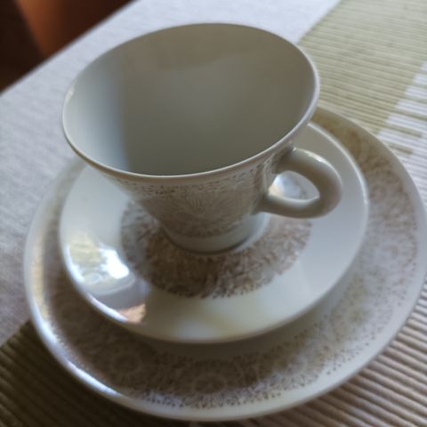 Ihanan herkät kultakoristeiset Filigran kahvikupit, kakkulautaset, tarjoiluvati ja sokerikko. MMM