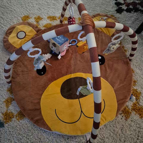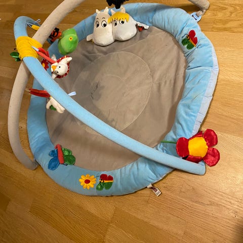 Muumi aiheinen leikkimatto, jossa roikkuvia leluja. Pehmeää materiaalia.