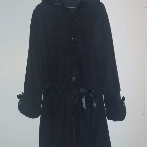 Käytetty kahdesti, näyttää kuin uudelta. Etupuolella kaksi sydämen muotoista taskua ja paljon rusetteja ympäri takkia, takapuolella kaunis nyöritys jota saa säädettyä. Takissa vetoketju sekä viisi isoa nappia. Huppu on aika iso, takki itsessään 3XL.