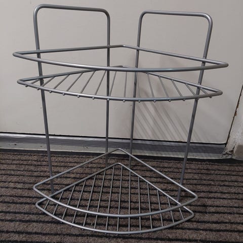 Suihkun seinälle kulmahylly. Ei sisällä kiinnikkeitä. Kiinteillä koukuilla tai imukupeilla seinään kiinni. Hieman kalkkijäämiä. Syvyys ja leveys 20, korkeus 31.
