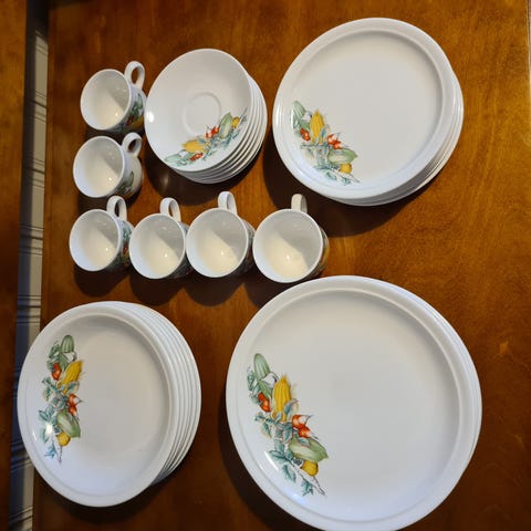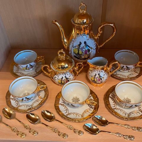 Kuvan ehjä ja hyvässä kunnossa oleva mokka-astiasti. Kuppeja 6, tasseja 5, kahvikannu, sokerikko ja kermakko.