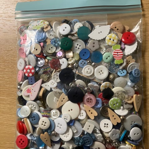 Näytekappaleita, eri kokoja. Muovia ja metallia. Näistä saa hauskoja koristeita vaatteisiin. Yhdestä napista kansi poissa, katso viimeinen kuva.