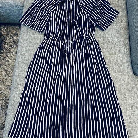 Ihana Raiku-mekko koko 42, 100% puuvillaa, taskut ja vyö. Selässä pieni pätkä joustoa, muuten kangas ei jousta.