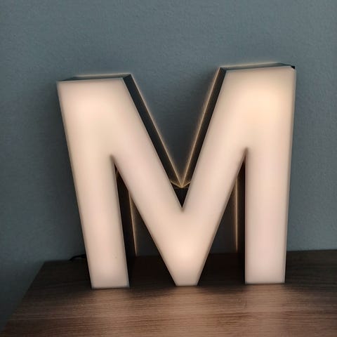 Valokirjain, valaisin. Valkoinen ja mustat reunat. Käy sekä sisälle että ulos. Korkeus 67 cm, leveys 28 cm, syvyys 12,5 cm.