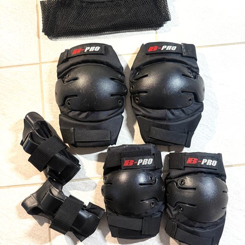 Mustat käyttämättömät suojat paketissaan. Kyynärpää-, polvi-, rannesuojat. Lasten koko XS. Pk ostajalle.