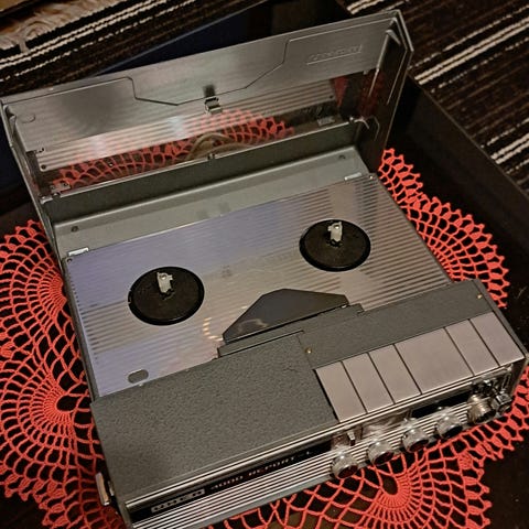 Kuvien ja otsikon mukainen länsisaksalainen kelanauhuri. Kuulemma toimii kunhan siihen asennetaan muutamaa remmiä, jotka ovat ajan myötä kuivuneet.