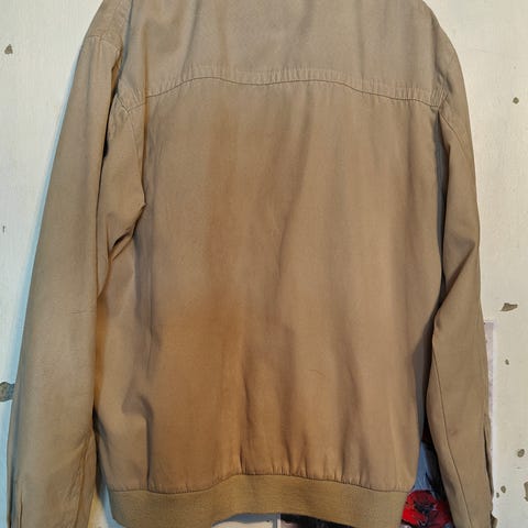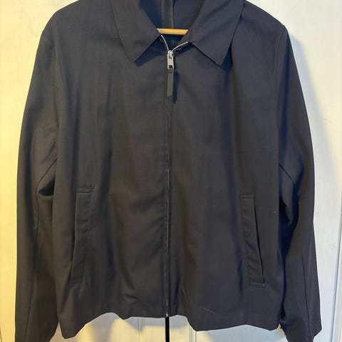 Tummansininen takki punaisilla ja valkoisilla yksityiskohdilla.