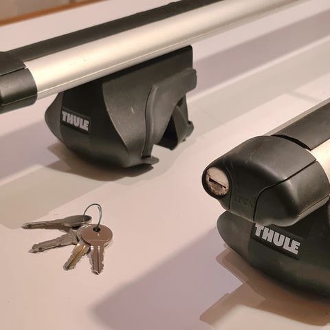 Myydään Thule System 1050 -sarjan kattotelineet, joissa on mukana kaksi paria saman sarjan suksi- ja lumilautatelineitä 1050/12. Taakkatelineet kiinnittyvät vesikouruun, eli sopivat vanhoihin kattokourullisiin autoihin. Myös uudempien autojen merkkikohtaisia kiinnikkeitä näihin on saanut, mutta en osaa sanoa, saako enää. Suksitelineet ovat lukittavat, mutta avaimia ei taida enää löytyä. Uuden lukkosarjan saa varaosaliikkeestä muutamalla eurolla. Muita puutteita ei ole, mutta käytön jälkiä toki löytyy.