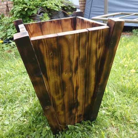 Painekyllästetystä puusta itse tehty kukkaruukku. Ulkopinta poltettu, jonka jälkeen pinta käsittely puuöljyllä. Mitat: korkeus 53cm, yläosan sisähalkaisija 27cm, yläosan ulkohalkaisija 37cm, alaosan ulkohalkaisija 30cm.